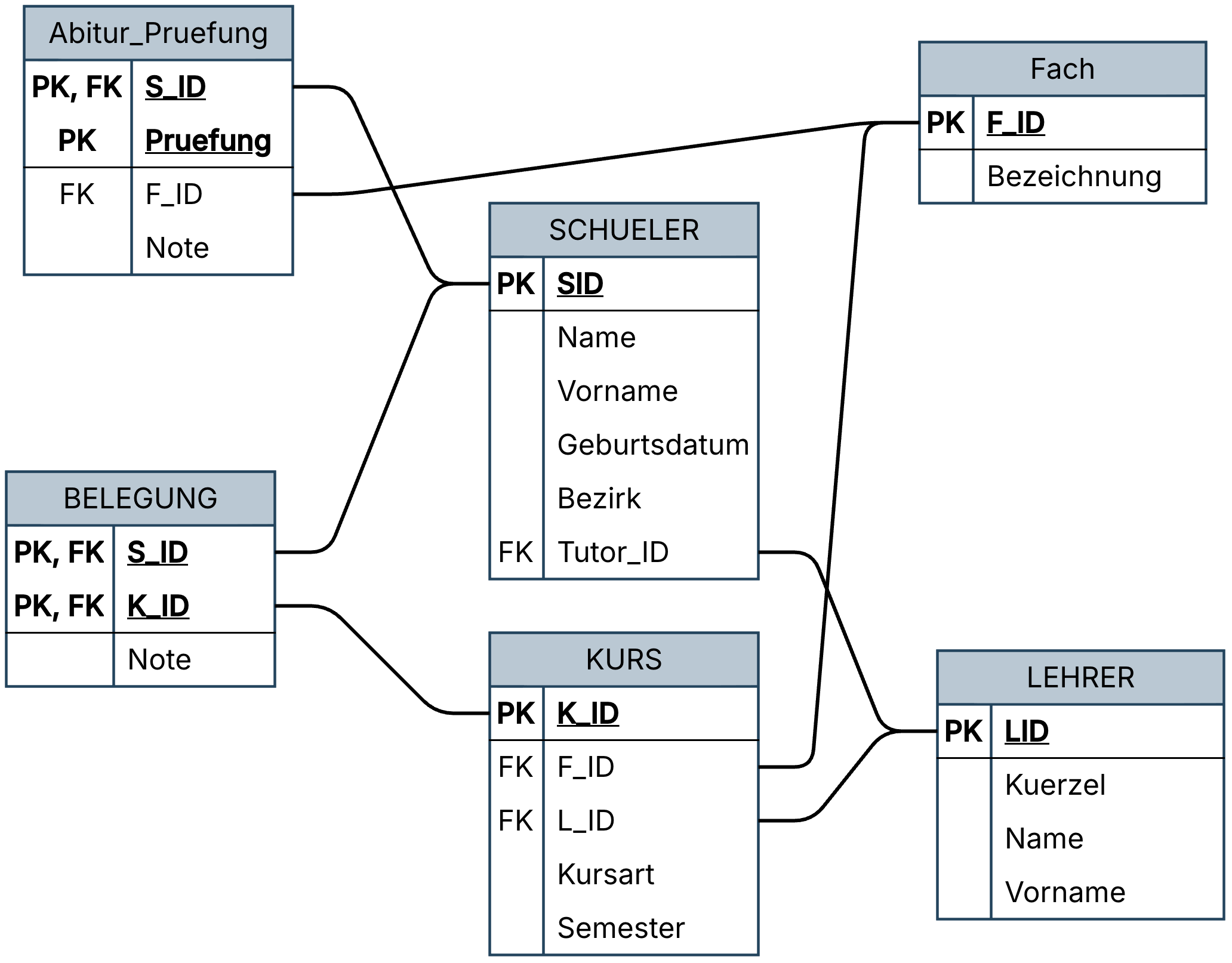 - Abitur_Pruefung (↑S_ID, Pruefung, ↑F_ID, Note)